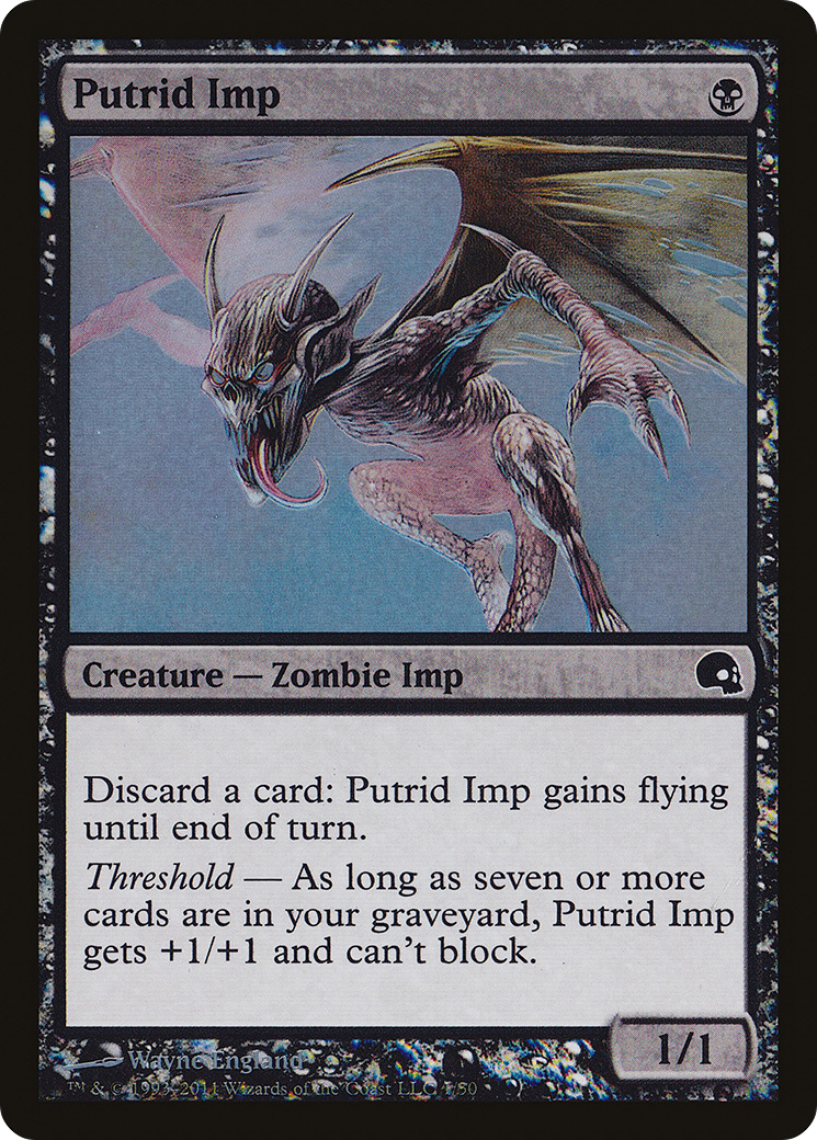 Threshold — As long as seven or more cards are in your graveyard, Putrid Imp gets +1/+1 and can't block.
