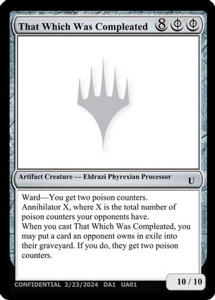 When you cast That Which Was Compleated, you may put a card an opponent owns in exile into their graveyard. If you do, they get two poison counters.