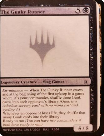 Ew-minance — When The Gunky Runner enters and at the beginning of the first upkeep in a game where it's your commander, shuffle three Gunk cards into each opponents library. (Gunk is a colorless sorcery card with no mana cost and cycling {4}.)
