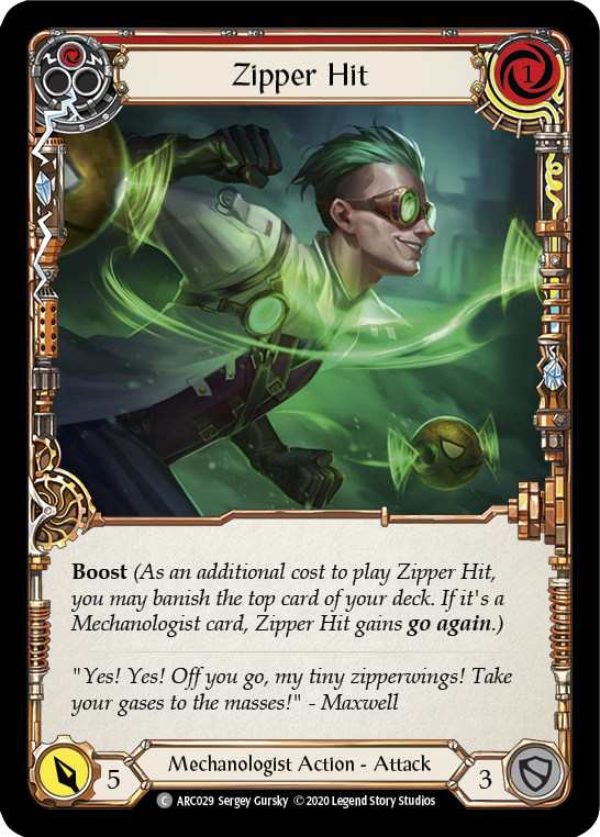 Boost (As an additional cost to play Zipper Hit, you may banish the top card of your deck. If it's a Mechanologist card, Zipper Hit gains go again.)